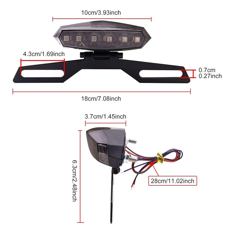 - ★【Motorcycle Rear Light Specification】Material: Plastic + LED + Metal Working Voltage: DC 12V Lens Color: Smoke Emitting Color: White + Red Function: Brake + Positionitioning Screw Hole Diameter for License Plate Mounting: M7 Wire Length: 11.0 inches (28 cm) Wiring Method: 3-wire connection