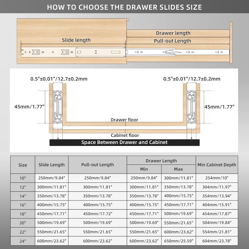 - ✅【Side Drawer Runners】1 pair (2 pack) mounting screws included. Length: 250 mm. You can choose the size of the rails according to the depth of the drawer. * The length of the slider should be ≤ the length of the drawer. Mounting distance: 12.5mm (each) Easy to install.