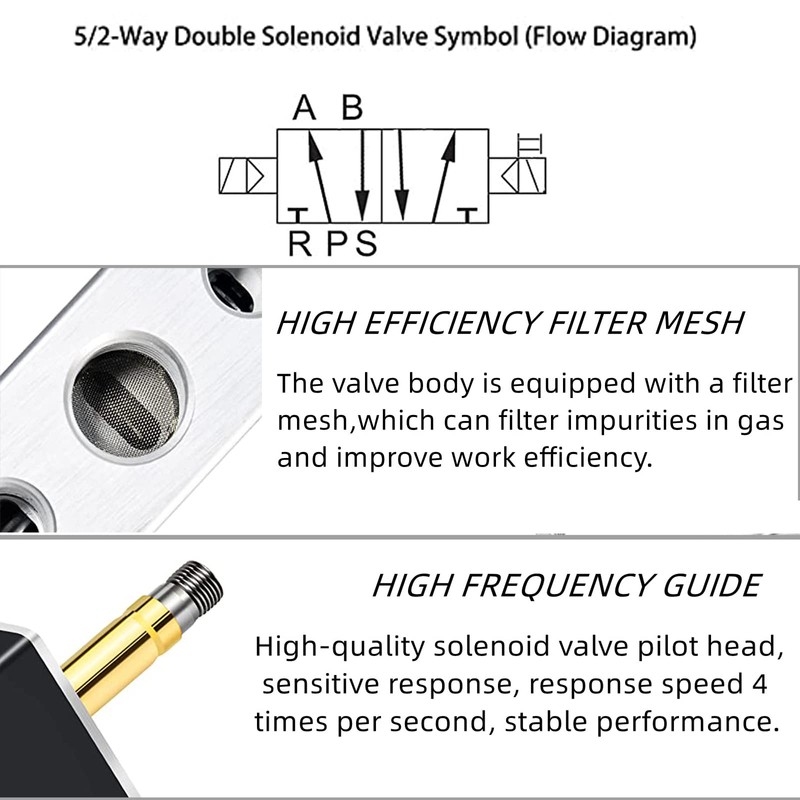 - 【UNIVERSAL DESIGN】 Pneumatic Solenoid Valve Type: 5 Port 2 Position ; Voltage : DC 12V ; Exhaust Hole size: 1/8" PT ; Air Flow In and Out Hole Size : 1/4" PT