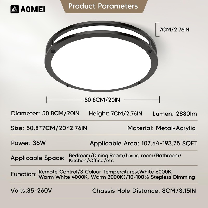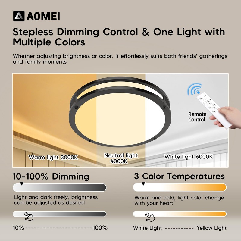 AOMEI Flush Mount Ceiling Light Fixture,Super Bright Dimmable 3000K-6000K Round LED Modern Ceiling Lamps for Bedroom Kitchen,Bathroom and Hallway,Nickle lease Note: This fixture is specifically designed to work ONLY with the included remote control for dimming functions. For optimal performance and safety: Do NOT connect to wall dimmer switches (triac/leading-edge/magnetic dimmers) Use only the provided remote to adjust brightness levels Using third-party dimmers may cause flickering, performance issues, or void warranty.