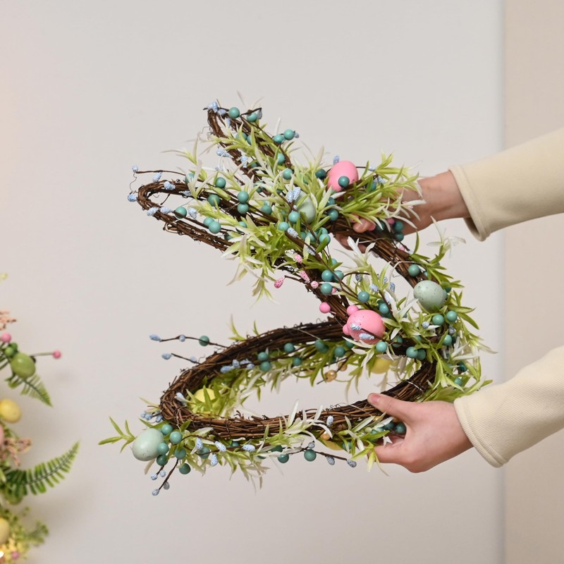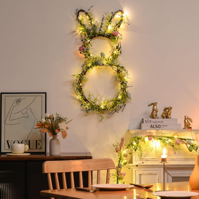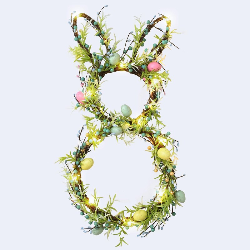 • Product Details: The light up bunny wreath measures 11.82'Lx26'H, green artificial leaves and twigs, trimmed with bunches of pastel foam eggs and berries, lush and thick to add festival atmosphere and make your spring decoration full of the breath of nature