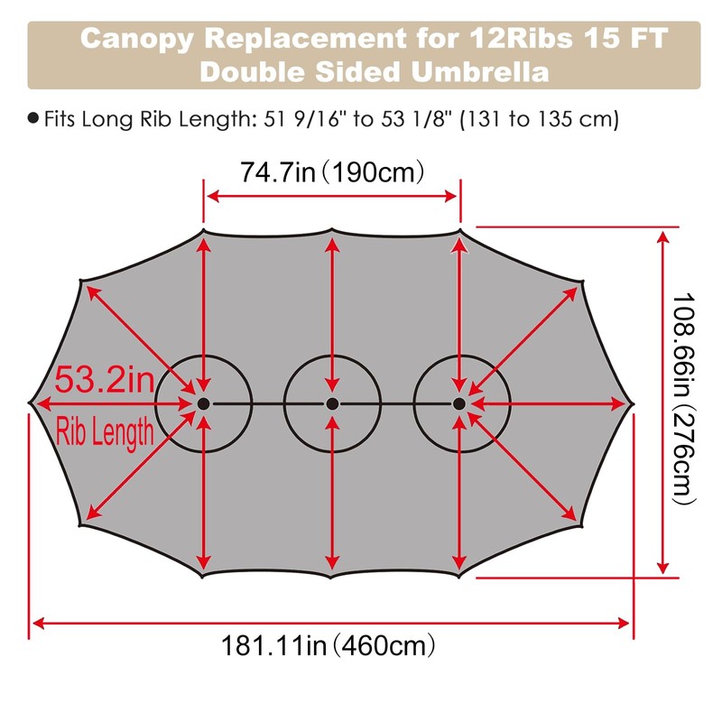 - Umbrella replacement canopy for 12 ribs 15' x 8.8' double-sided umbrella,Canopy Top Fit Ribs Length: 54.9'' to 56.9”; ONLY TOP,FRAME NOT INCLUDED