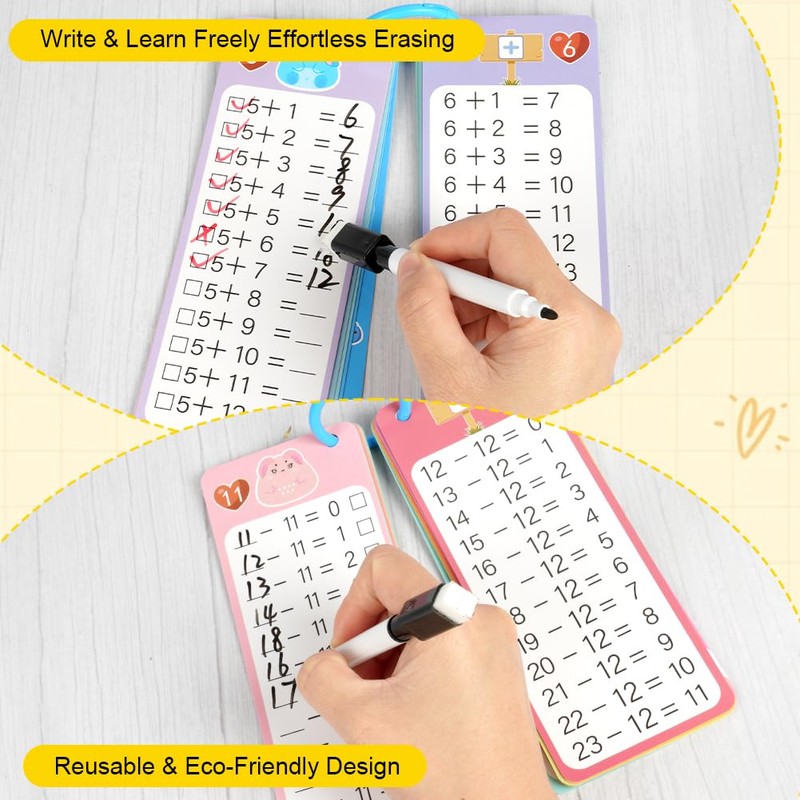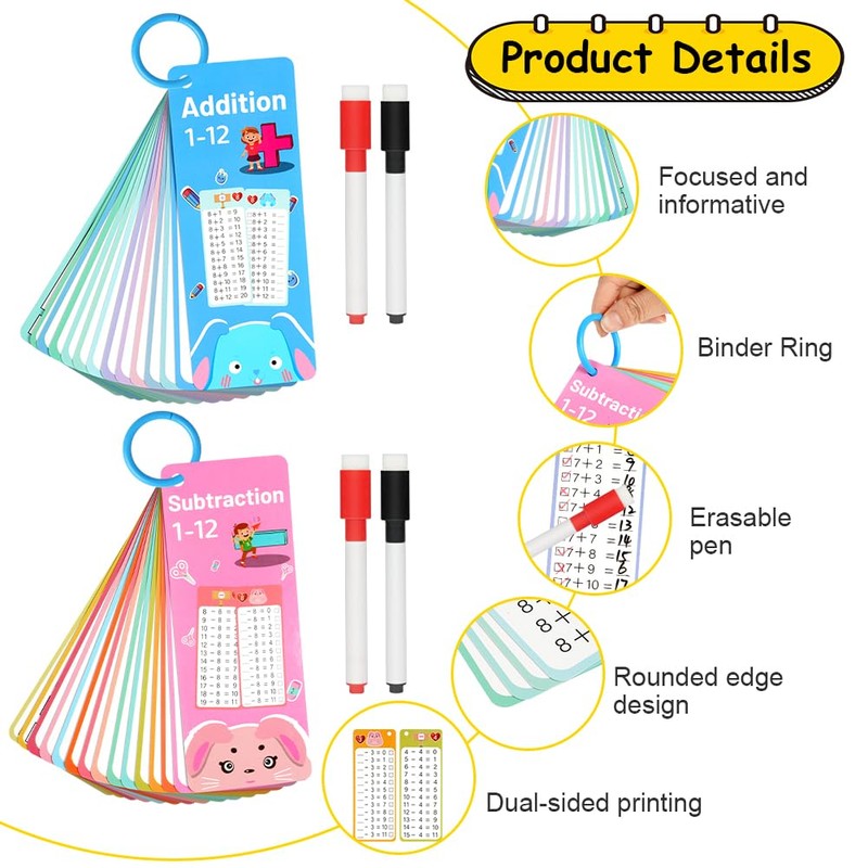 - Great Value Package: Our math learning cards include addition flashcards and subtraction table flashcards, each set containing 15 cards, 4 dry erase pens, ensuring that your child has enough materials to participate in math games efficiently