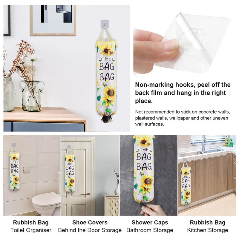 AOOTUERL Sunflower Plastic Bag Holder for Kitchen, carrier bag storage, plastic bag holder with Sticky Hooks, Plastic Bag Organizer and Dispenser Wall Mount Plastic Bags Dispenser for Home Kitchen