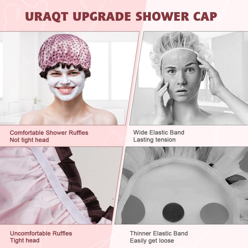 - High elasticity: Our shower caps for women are of good quality, the elastic band on the bottom leaves no terrible marks on your forehead. The good elasticity of the elastic band makes the shower cap durable and can be used to hold hair when showering or cleaning.