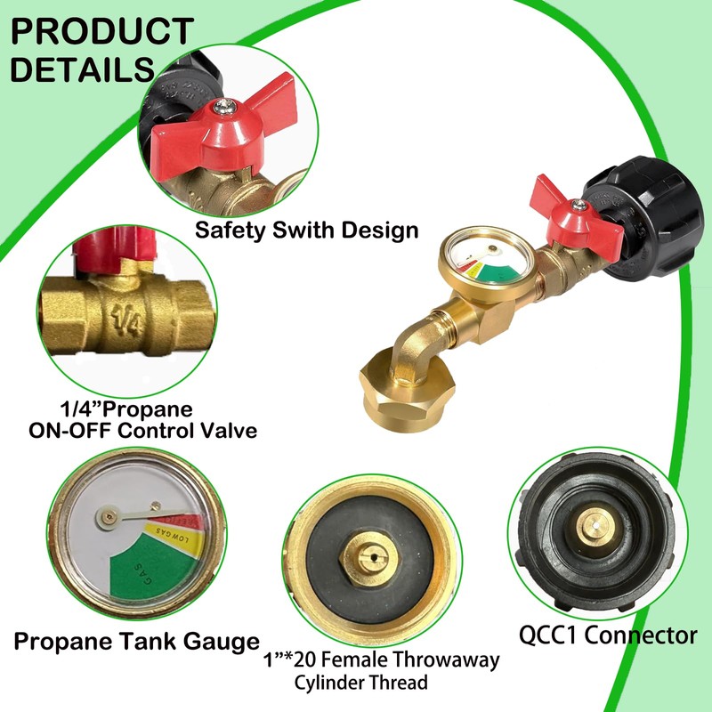- Upgraded Design: Enhance your propane experience with the 1 lb propane tank refill adapter. The 90-degree elbow enhances gas flow to small cylinder. Fits QCC1/Type 1 propane tank,Glow-in-the-dark gauge ensures night monitoring of gas tank, and on/off valve prevents leaks. Connect large tank to 1 lb bottle effortlessly, no extra tools needed. Includes 4 caps and sealing tape for added convenience