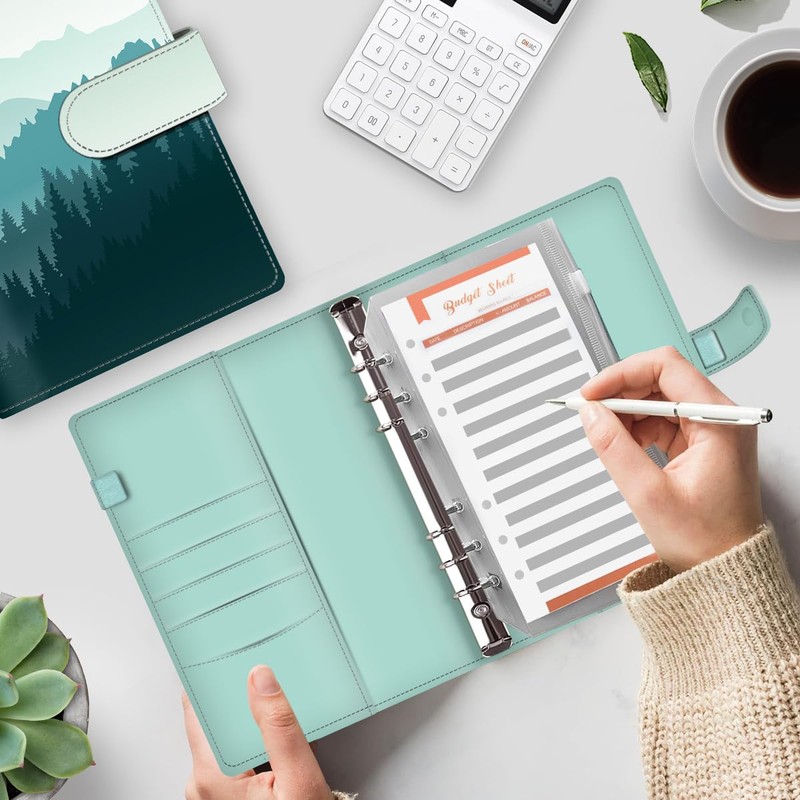 AOPEFNX Budget Binder, Cute A6 Money Saving Binder with Zipper Envelopes, PU Leather Money Organizer for Cash, Expense Budget Sheets and Cash Envelopes for Budgeting Green Mountain