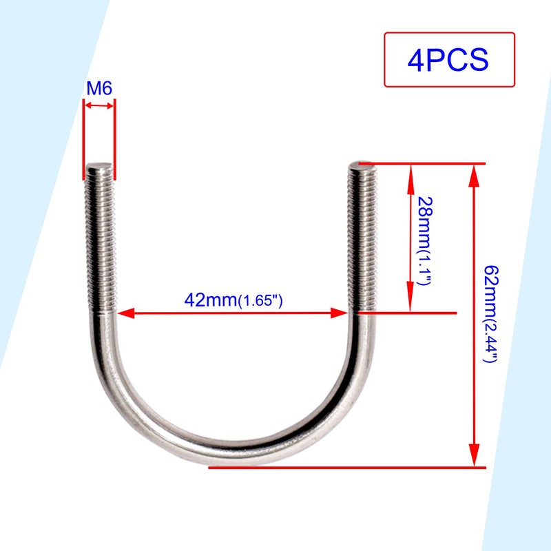 - ※U-Bolts Specification: U-Bolts Diameter (M6) x Overall Width x Overall Height: (5.2 x 62 x 54mm) / (1/4" x 2-1/2" x 2.12"). Groove Width: 42mm / 1-1/2". Perfectly Suitable for Round Tube Size 42mm / 1-1/2". M6 Self-locking Hex Nuts Thread Length: 28mm. With Corresponding Flat Gaskets. Surface Color: Silver.