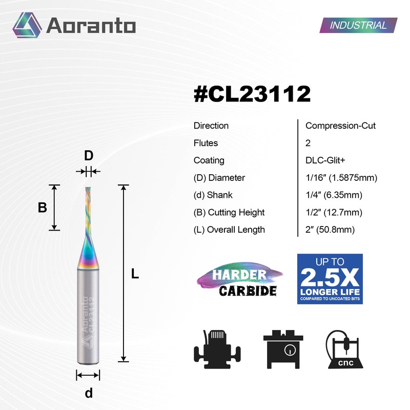Aoranto CL23112 1/16" Up&Down Compression Spiral CNC Router Bit 1/4" Shank, Industrial Quality Extra Long Life Coating Solid Carbide End Mill for Wood Mortise Slot Carving, 1/16" Dia x 1/2" CL, 2 Pack