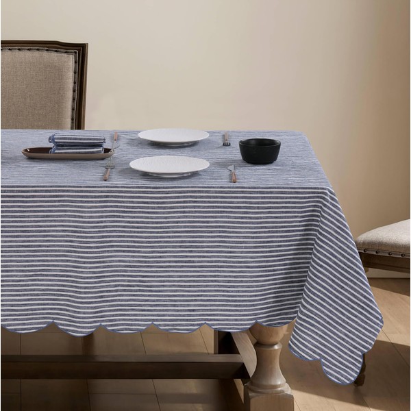 AORISSI 100% French Flax Linen Tablecloths Scalloped Embroidery Rectangle 108Lx60W Inch for Dinners, Parties, Spring, Machine Washable, 8-10 Sets, Blue Stripe(Edges-Blue)