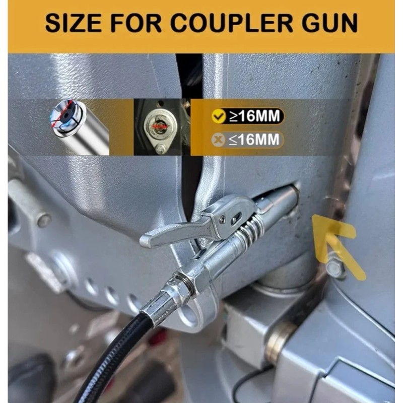 【Wide application】grease gun coupler fits all 1/8" NPT standard grease gun, Pneumatic Grease Gun, manual grease gun, electric grease gun, also suitable for all DIN and SAE grease nipples and all SAE and metric Zerk joints. Simply replace your existing grease gun coupler and this Strong grease gun tool is ready for use in automotive repair, job site large machinery and axles and drive trains, it is also great for lubricating farm tractors, plows, stump pullers, disc harrows, seeders and more.