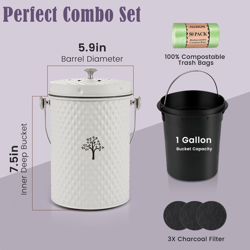- 【FUNCTIONAL SET】: The modern-style design will complement any kitchen decoration.Modern embossed look design can be used not only as a garbage collection, but also as a decorative piece for planting flowers.Our set includes 1pcs metal outer compost bin with lid, 1pcs plastic Inner bucket, 3pcs Charcoal Filters,50 pack trash bags.