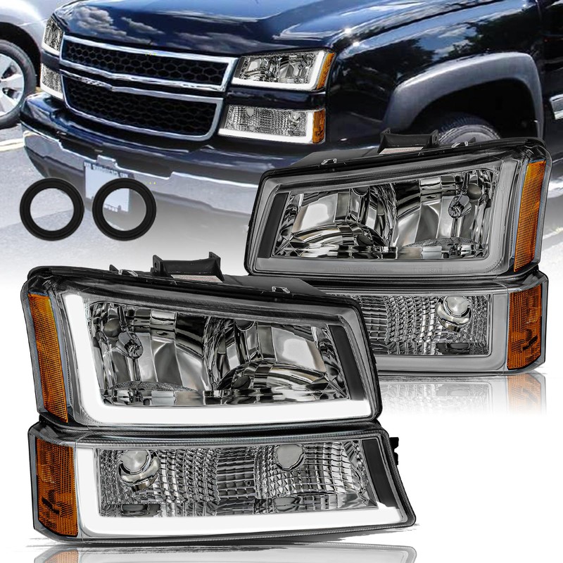 Aosky 4PCS L Shape LED DRL Headlight Assembly for 2003-2006 Chevy Silverado /03-06 Avalanche 2500(Fit No Cladding only) OE Style Smoke & Amber