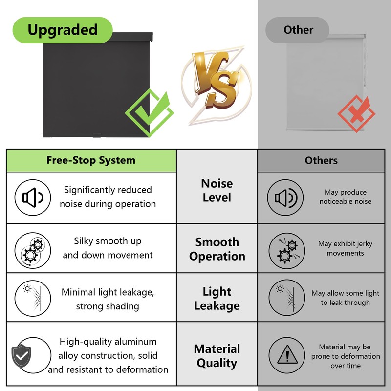 • [Innovative Free-Stop System]: Experience effortless control with our blackout roller shade's innovative free-stop system. Easily adjust the shade to your desired height, allowing for precise light control and privacy, without the hassle of traditional cords or chains.