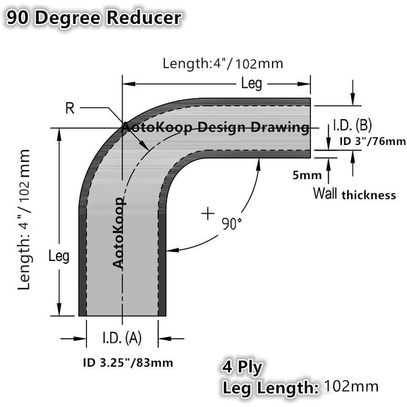 Size: 90 degree silicone elbow, leg length 5 (125mm),4-Ply Nylon 0.2 thicknessAotoKoop Silicone HoseWe have a universal automotive silicone hose manufacture factory, and have over 10 years production experiences. we prove car modification replacement part for car modification fans.Silicone hose include 3/4 layers car turbo engines silicone products, and customize universal automotive (racing car & refitted car) replacement parts. Our products include general car silicone tube (straight hose, 45 degree hose, 45 degree hose, 135 degree silicone hose, U bend silicone hose, and all reducer silicone hose), different types of radiator silicone tube, Coupler & Turbo intercooler pipe, etc.Car modification replacement parts include:automotive engine replacement parts, engine room replacement parts (include air filter, sandwich adapter plate kit, etc.), wheel lug nuts, wheel spacers, car oil pipe adapter, cab replacement parts (Gear Shift Extender Kit etc.); and car decoration Accessories, etc.