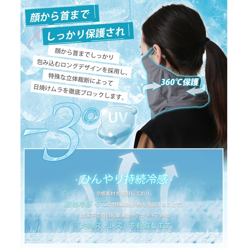- (Firmly protects your face and neck and keeps you cool) AOY sunburn prevention face cover uses a long design that securely wraps around your face and neck, and the special draping prevents uneven sunburns. In addition, the AOY sunscreen face cover uses a cooling sensation material, and the special fibers absorb heat at -7°F (-3°C), reducing burning stress when commuting to bicycle in the blazing sun or outdoor activities. In addition, AOY Sun Protection Face Cover can be folded compactly, so you can keep it in your bag at all times, even in sudden sunlight. AOY Sun Protection Face Cover keeps you comfortable even in hot weather