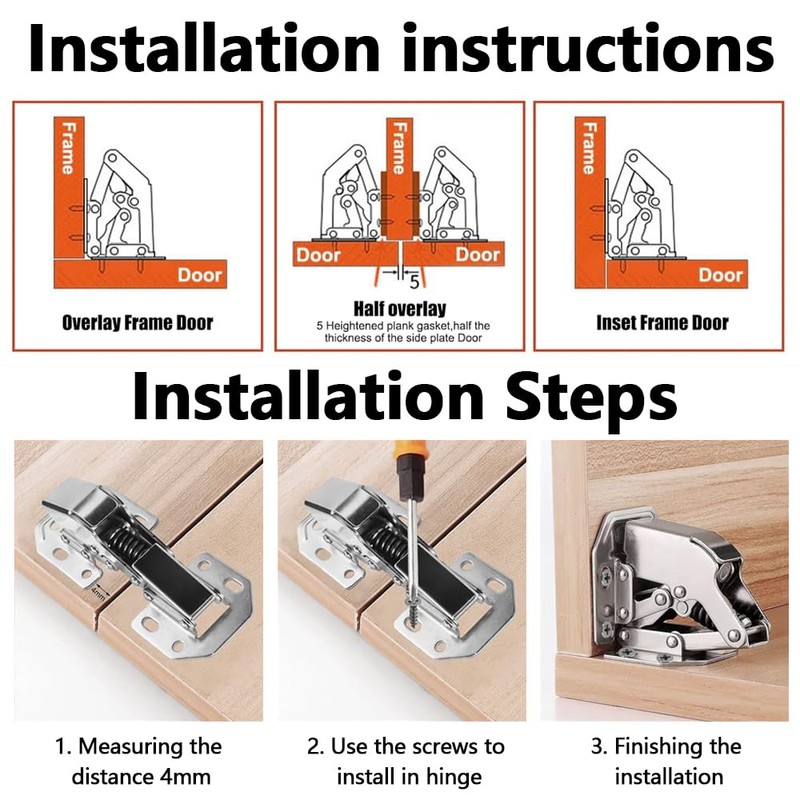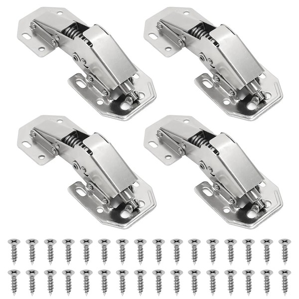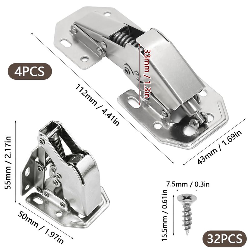 - Easy to install, only a screwdriver is required. The set contains 4 hinges cabinet door and 32 screws