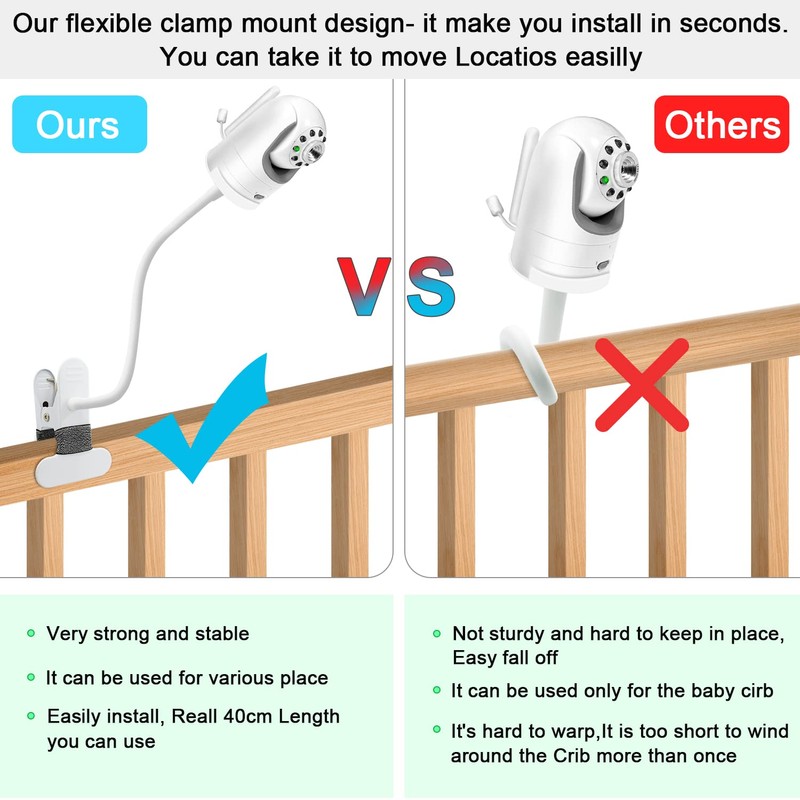 • Stable and Durable:The arm of our gooseneck adopts better materials and design.It is is made of aluminum and magnesium alloy ,It has improvements in both stability and durability.that guarantees its ability to hold your Nooie Baby Monitor securely even after being bent for thousand times The non-slip clamp is covered with foam material to prevent damage and scratches to your furniture