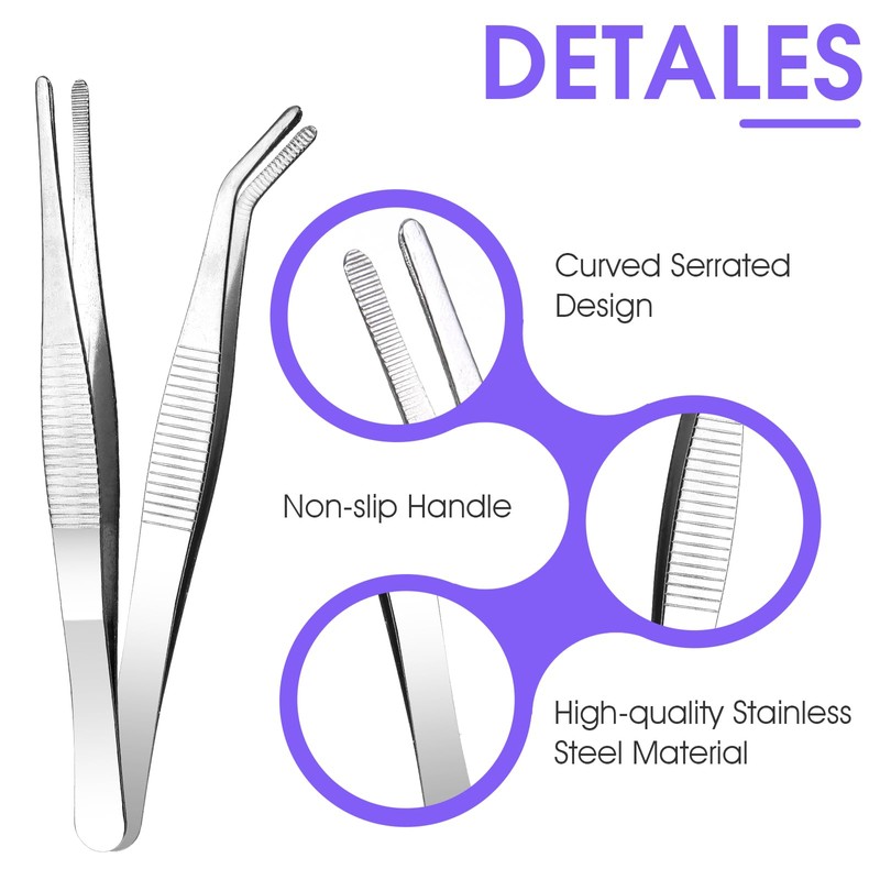 - Curved Serrated Design The tweezers have a curved serrated design at the tip that provides excellent grip and closure. With their superior hardness and deformation resistance, they ensure that items stay firmly trapped without slipping. The length is ergonomically balanced, which reduces user strain and minimises the risk of scratches. This thoughtful design increases safety and efficiency during use.