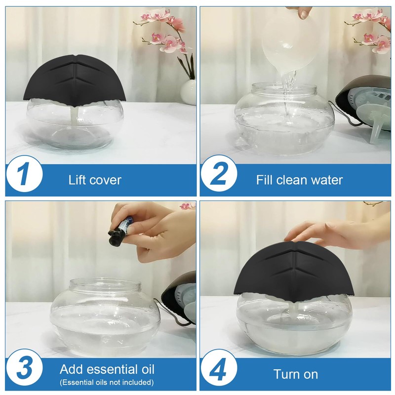 - Material: Made with BPA FREE material, the material just like baby bottle, no worry about the material will do harm for yourself. Please notice that bottle gall(transparent bowl at the bottom) is made of ABS plastic, It only needs to be cleaned with clean water or warm water, Not Hot Water. And you can add a few drops of essential oils into the Aroma Diffuser. (not included)