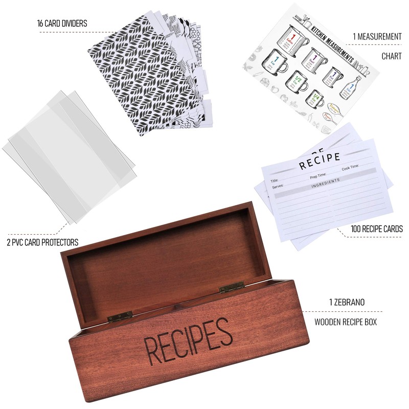 - SEE IT CLEARLY: Your recipe card holder has the word "recipes" emblazoned across it in large text. That way, everyone can see that the beautiful walnut, sapele or zebrano wooden is your treasured receipe box.