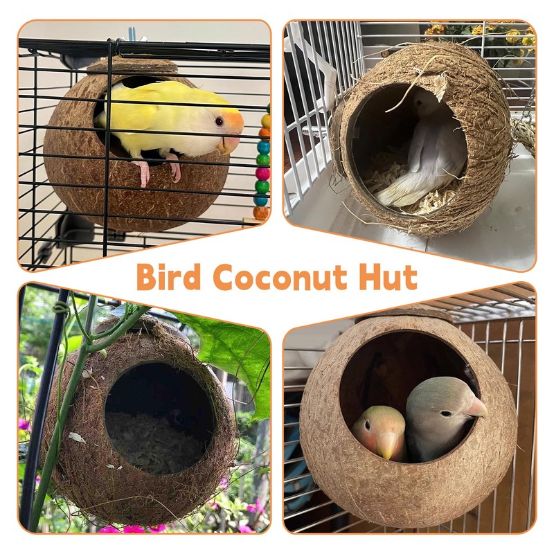 - Coconut Shell Birdhouses: Apatal Coconut bird house for cage give birds a place to rest and hide. There are two styles of bird cage nest to choose from: smooth surface (with a sanded surface), rough surface (with an unsanded surface)