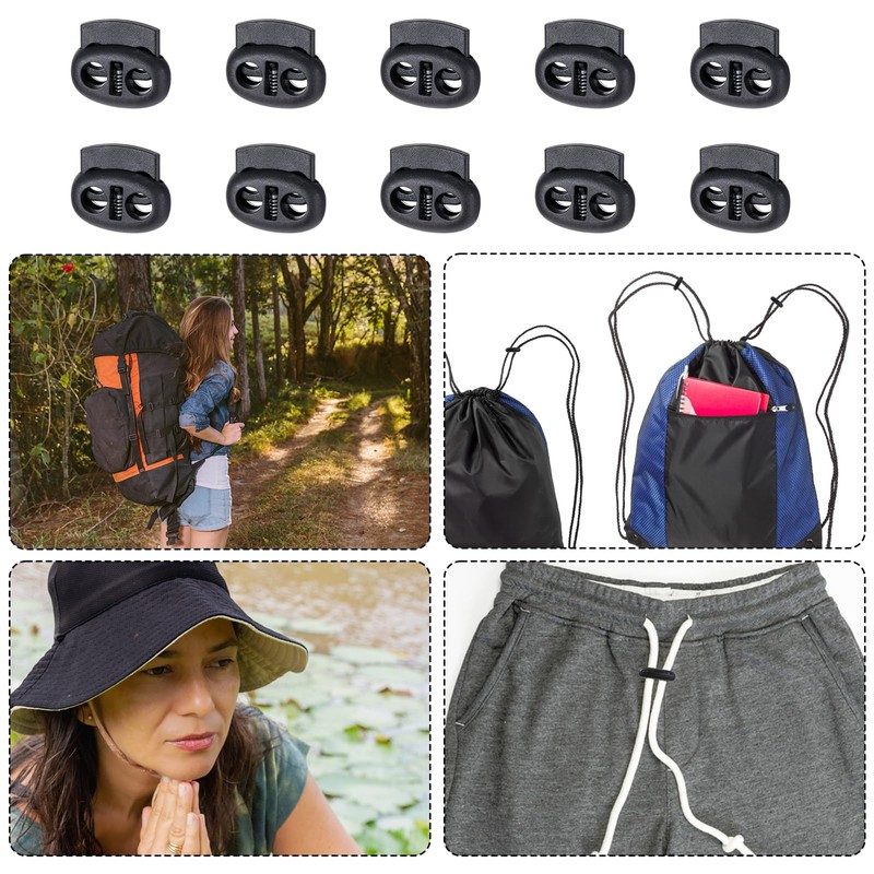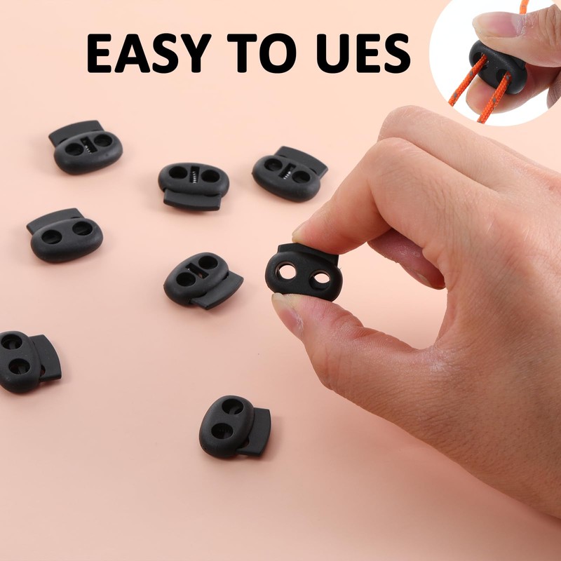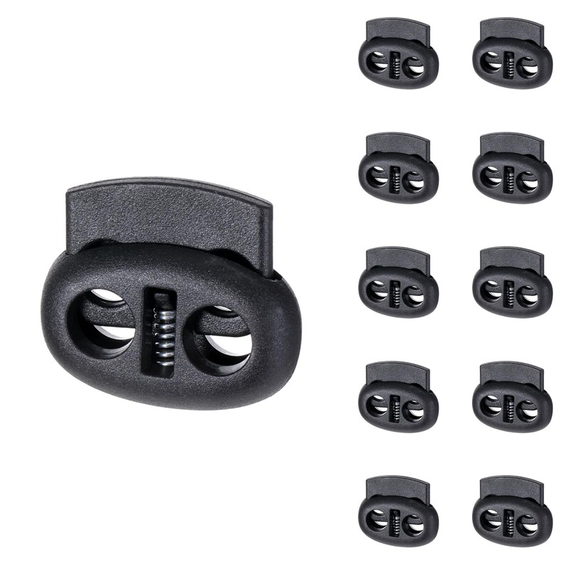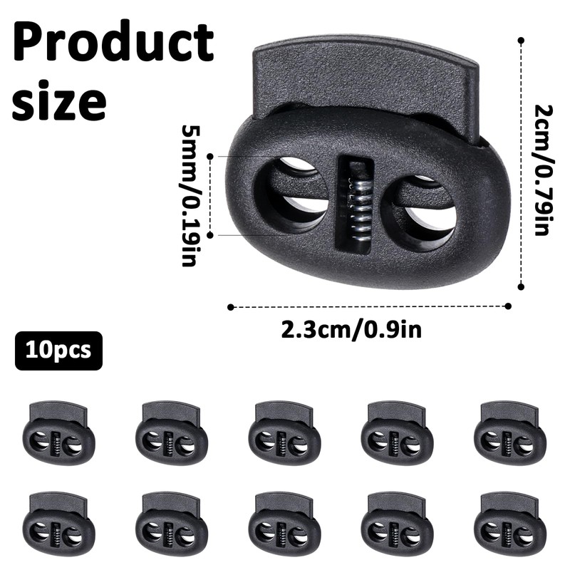 - Package Includes: You will receive 10 pieces of black plastic cord locks, ideal for DIY or replacing shoelaces. Each double hole cord lock stopper is about 2.3*2 cm/0.9*0.79 inch, enough quantity to meet all your daily needs.