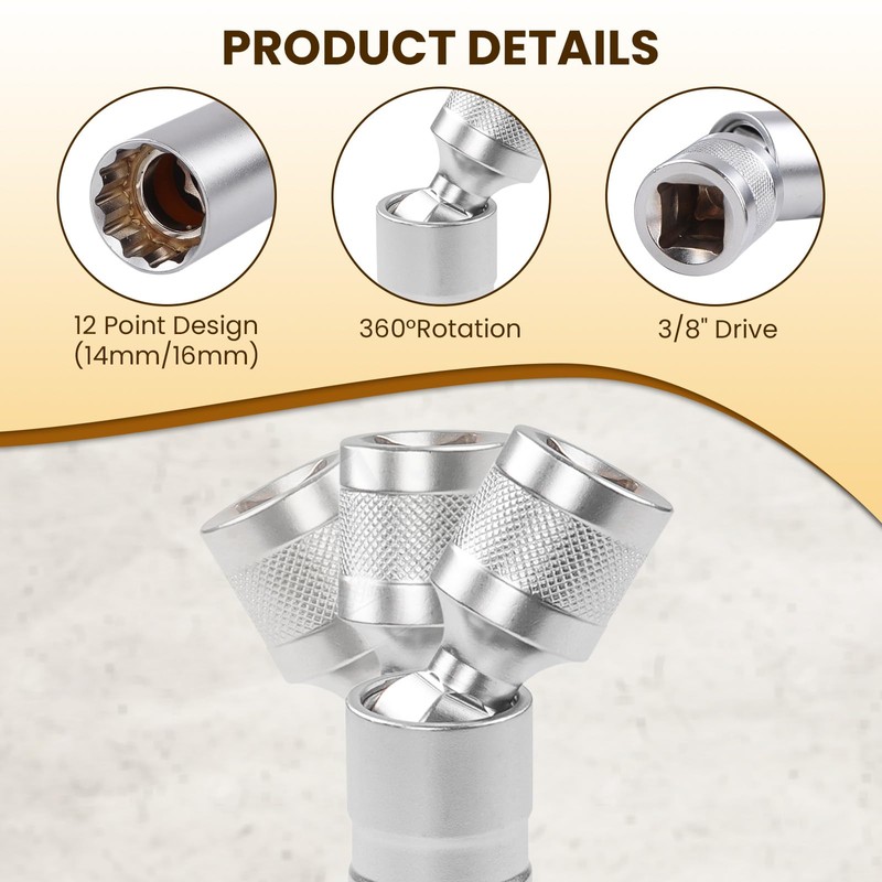 - SPARK PLUG WRENCH This 3/8" spark plug socket features a 12 point design, 16mm+14mm spark plug socket and a 3/8" spark plug wrench. The spark plug wrench set can be rotated 360 degrees for maximum flexibility