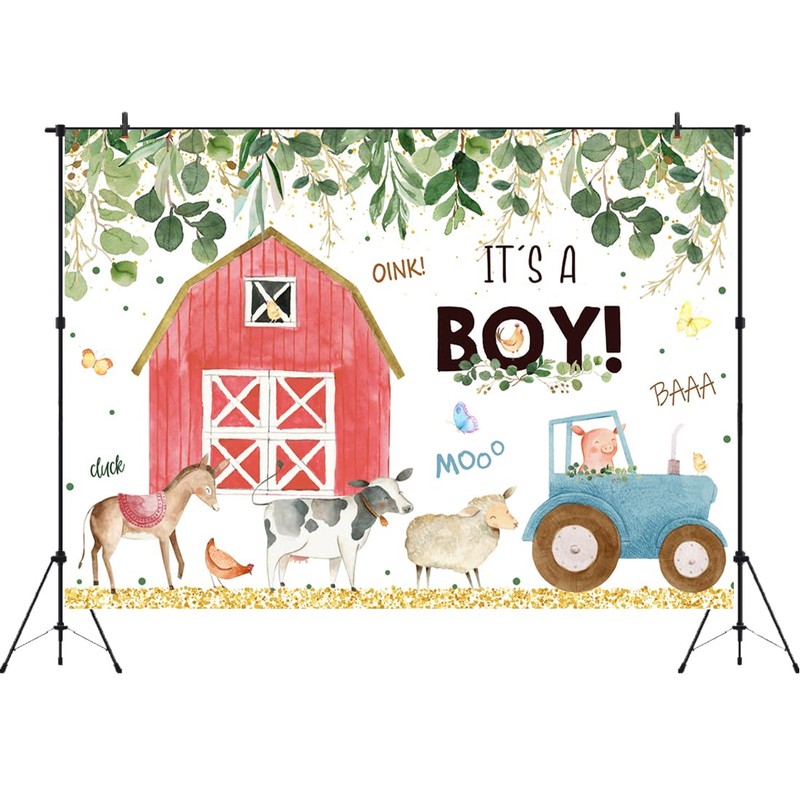 Aperturee Farm Animals Baby Shower Backdrop 7x5ft It's a Boy Red Barn Greenery Green Leaves Kids Prince Photography Background Oh Boy Newborn Party Decoration Banner Props Photo Booth