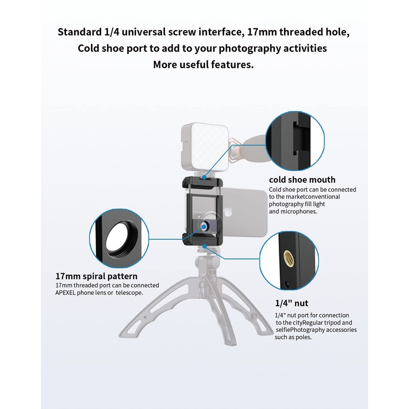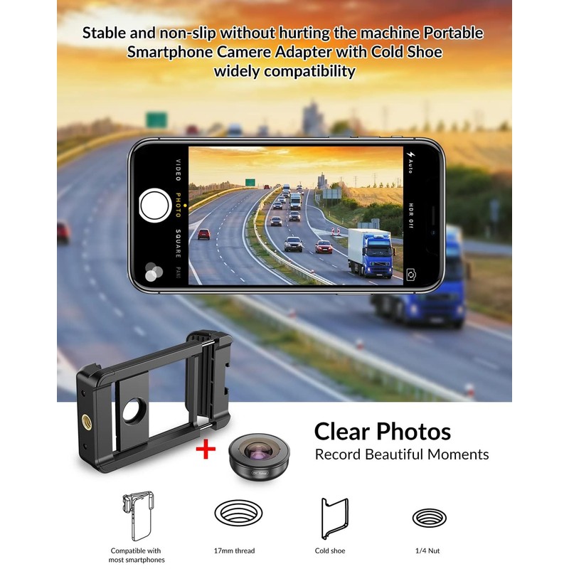 - Design for 17mm Threaded Lens Adapter: This lens phone adapter is designed for lenses with 17mm thread, allowing cell phone photography enthusiasts to have a more perfect photography experience, easier lens replacement and more stable shooting.