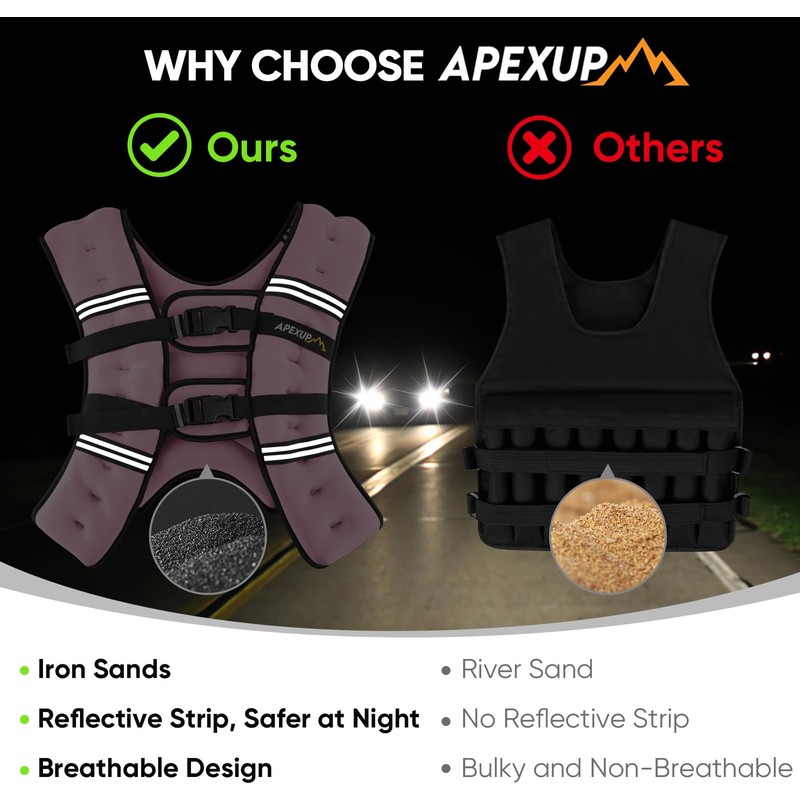 - [BOOST YOUR WORKOUT] APEXUP weighted vest is perfect for adding an extra challenge to your workout routine. The added resistance will help build strength, endurance, and improve overall fitness.