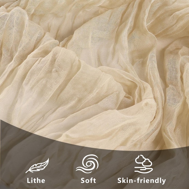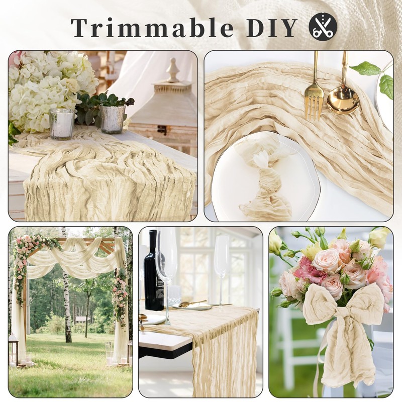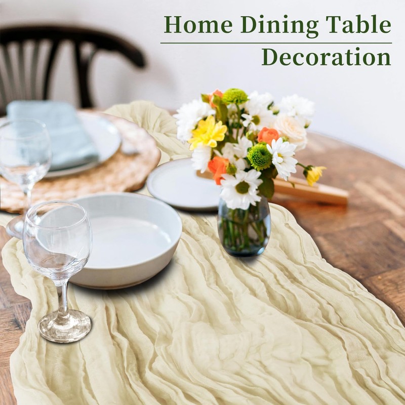 • Cheesecloth Table Runner Size: Cotton and linen gauze tablecloth runner with wrinkled, approx.35" wide and 10 ft length, which can fit for most kinds of tables, appropriate for a table that can seat 8-10 people. Large enough to fit the rectangle and round tables. Use more than table décor for wedding or party.