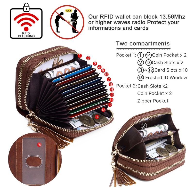 Structure:10 accordion upright card slots, 1 transparent ID window, 2 folded cash slots, 2 coin slots.