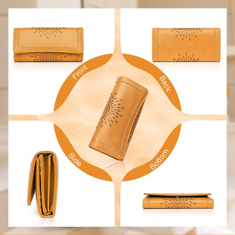 - 【 High quality PU leather Clutch】This ladies rfid wallet is made of high quality PU leather. Glossy,softer,more tear-resistant and easy to clean. Upgraded zipper slide easier and more smoothly, magnetic buckle button, more convenient. Elegant & Unique hollow out sunflower design, fit for work, travel, dating, shopping, etc.
