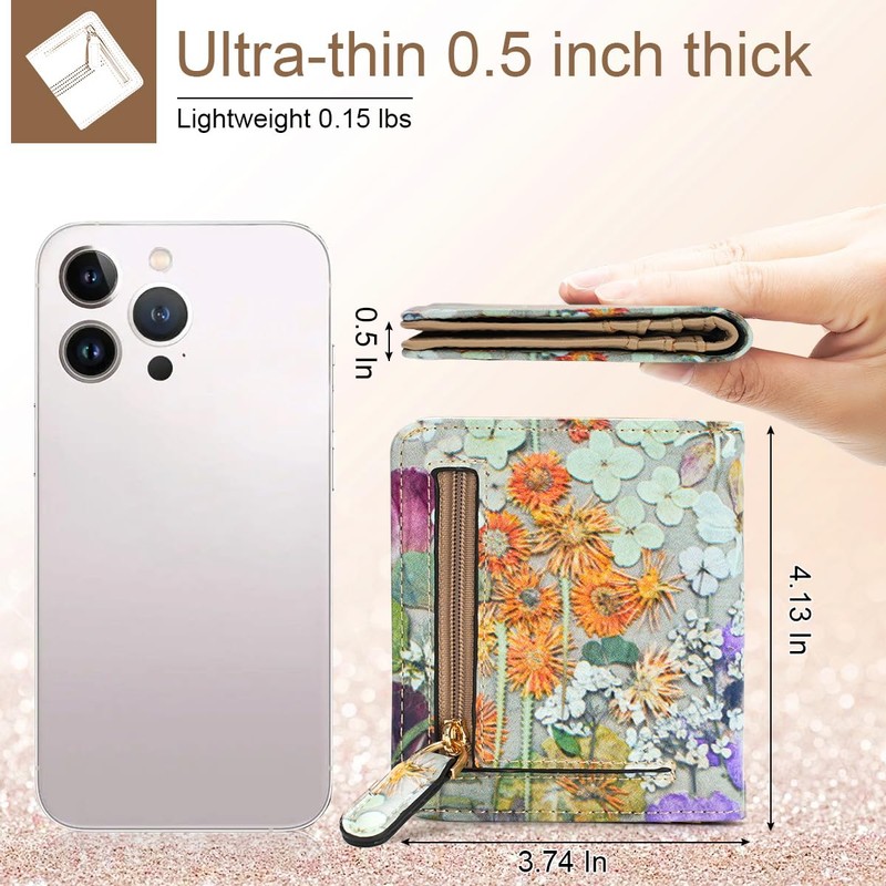 - 【Trendy & Compact Size】The small slim wallet purse with size of L3.74 X W0.59 X H4.13 inches(L9.5 X W1.5 X H 10.5CM), weight of 70g/0.15lb, thickness of only 0.5 inch is perfect for slipping in your pocket, purse or handbag. Our small but roomy womens wallet is ideally made to carry all your important stuff.