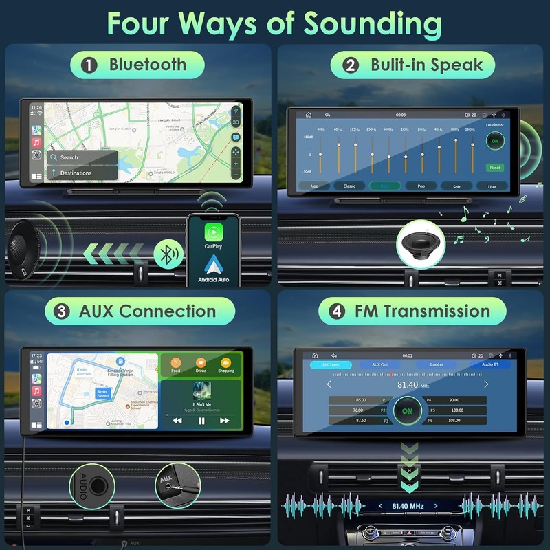 - 🚙【4 Ways Audio Output】: The Upgraded carplay screen can be wirelessly connected to the car stereo via Bluetooth on the phone, allowing you to enjoy high-quality sound without loss【Recommend using Bluetooth to connect to car audio】. The carplay box can also be connected to the car stereo through an AUX cable or transmitted through FM channels. In addition, there is a high-quality built-in speaker in the device, giving you four different ways to experience sound.