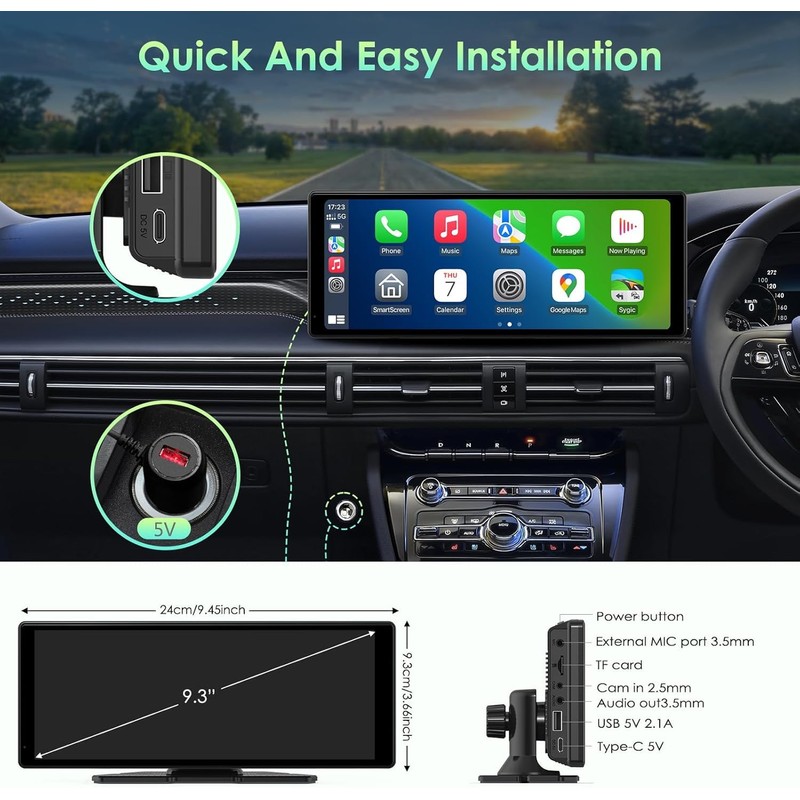 - 🚙【Siri & Google Assistant Intelligent Voice Control】: The wireless car play screen has a built-in clear microphone, and there is also an external microphone interface (not include micrphone), which allows you to answer calls while driving without having to hold your phone all the time. You can send voice commands to access Siri/Google Assistant such as "Call", "GPS Navigation", "Send Message", etc. It is very easy to use.