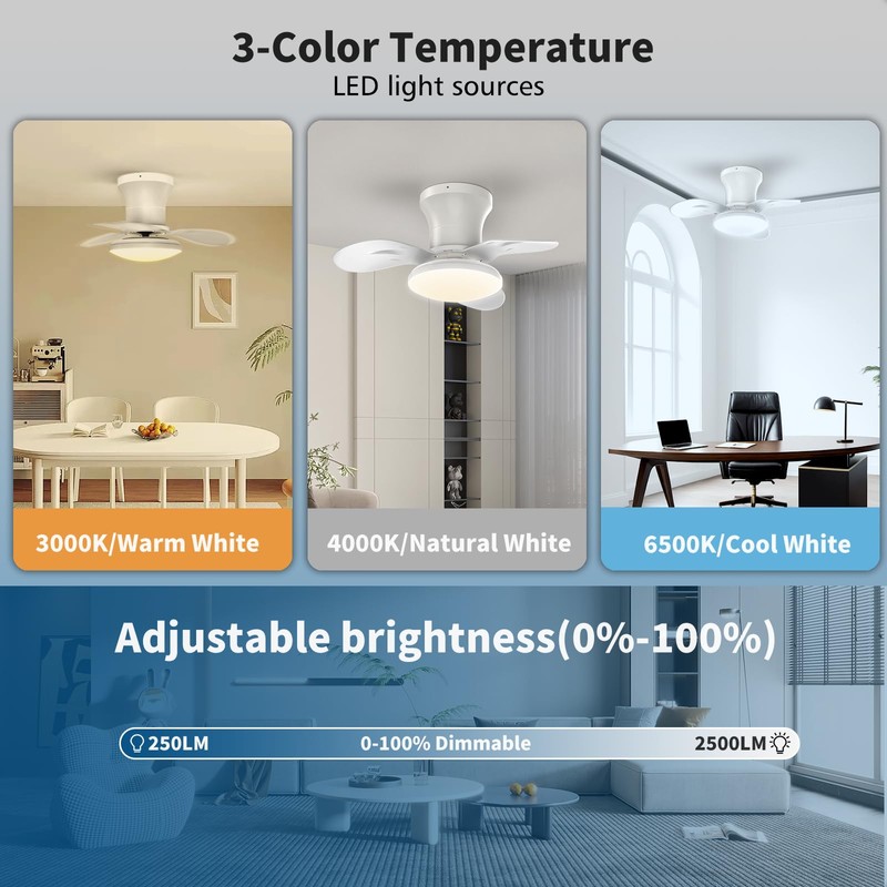 - Remote Control & App Operation: Enjoy the convenience of controlling your fan and light with the included remote or via a mobile app. Adjust fan speed (6 levels), light brightness (10%-100%), and 3 color temperature (3000K warm white, 4000K natural white, 6500K cool white) with ease. Set timers for automatic shutoff and enjoy seamless operation.