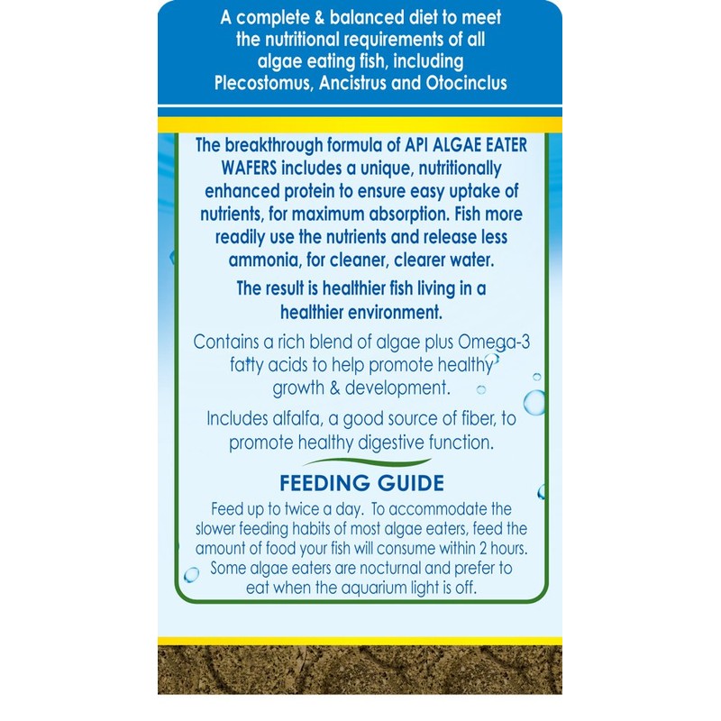 The breakthrough formula of API ALGAE EATER WAFERS Fish Food includes a unique, nutritionally enhanced protein to ensure easy uptake of nutrients and enhanced absorption. Fish more readily use the nutrients and release up to 30% less ammonia, for cleaner, clearer water. The result is healthier fish living in a healthier environment. API ALGAE EATER WAFERS Fish Food contains a rich blend of algae plus Omega-3 fatty acids to help promote healthy growth. This unique formula also contain alfalfa, a good source of fiber. API ALGAE EATER WAFERS Fish Food is a complete & balanced diet to meet the nutritional requirements of all algae-eating fish, including Plecos (Plecostomus), Ancistrus and Otocinclus. API Fish Food is formulated for a variety of popular fish such as cichlids, goldfish, tetra, betta, angelfish and more with high quality ingredients fish love such as algae, shrimp, worms and more. Keep your fish healthy, happy and colorful with food that contains optimal levels of nutrients as well as helps produce less waste, toxins and stress. For delayed release try API VACATION and WEEKEND PYRAMID FEEDERS.