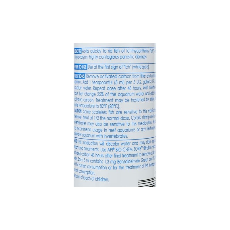 Rid your fish of ich quickly and effectively with API LIQUID SUPER ICK CURE Freshwater and Saltwater Fish Medicatio. API LIQUID SUPER ICK CURE Freshwater and Saltwater Fish Medicatio works quickly to heal freshwater fish of icthyophthirius ("Ich") or Cryptocaryon, highly contagious parasitic diseases. Ich, also called white spot disease, is a highly contagious and destructive, microscopic parasite that burrows into gill and skin tissue, causing severe damage and secondary infections. Early symptoms include white spots, darting and scratching against surfaces while more advanced stages can cause labored breathing. This freshwater fish treatment not only helps cure Ich, but it also provides a synthetic slime coat that helps protect against secondary infection, where the natural slime coating of the fish has been disturbed by the parasite. Use at the first sign of "Ich" or white spots. Some scaleless fish are sensitive to this medication, so treat them with 1/2 the normal dose. Some saltwater invertebrates, such as corals, may be sensitive to this product, so it is not recommended for reef aquariums. This medication will cause a slight discoloration of water which can be easily removed by adding activated carbon to the filter. Dose according to directions on product packaging and label. This treatment can be used in freshwater or saltwater aquariums. With API Aquarium products, it's easy to keep a beautiful saltwater, freshwater or reef aquarium. For over 50 years, API has been creating innovative, research-driven solutions that make it easier to care for your fish and aquarium. API Aquarium Treatment Supplies are designed to work in conjunction with each other to provide best results to control algae, promote healthy bacterial growth and help control and cure fish diseases and conditions such as ich and fin rot. They work to provide a safe, hospitable environment for fish such as tropical community fish, cichlids, goldfish and more. With API, you can spend more time admiring your fish, and less time scrubbing your tank. Make sure to use all products as directed in order to ensure the best results.