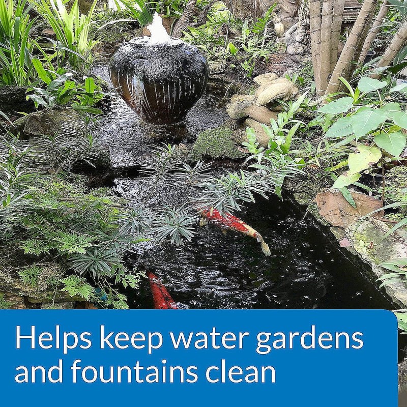 • Controls green water to keep pond water clean and clear in ornamental ponds and water gardens