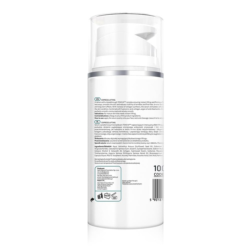- Unique composition – Apis Express Lifting brightening eye lifting serum is based on the TENS'UP complex, hyaluronic acid, ceramides and silk proteins. The product also contains flax and avocado extracts as well as sunflower and argan oil