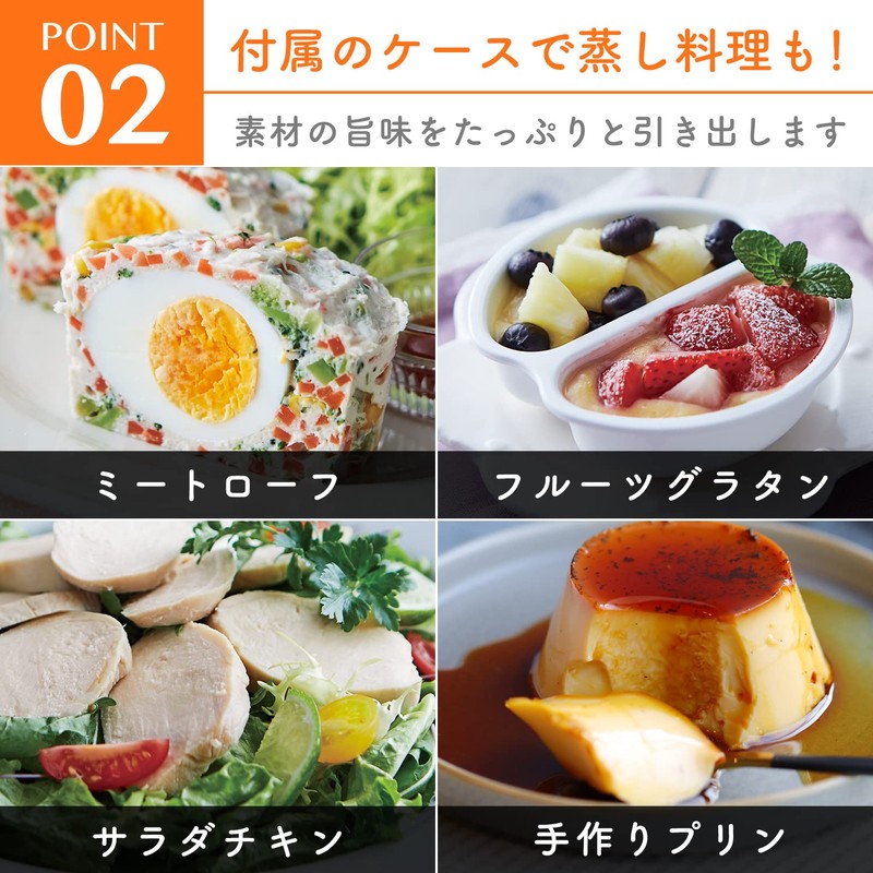 • There are 4 types of menu: semi-ripe, hard boil, hot springs, and steam. Easily make hot spring eggs that are difficult to adjust temperature. In addition, using the included case, you can also create "steamy" dishes from steaming rice bowls, pudding, salad chicken and gullets. It also comes with a recipe book with 10 items that can be used to make breakfast and lunch, as well as diet meals and snacks