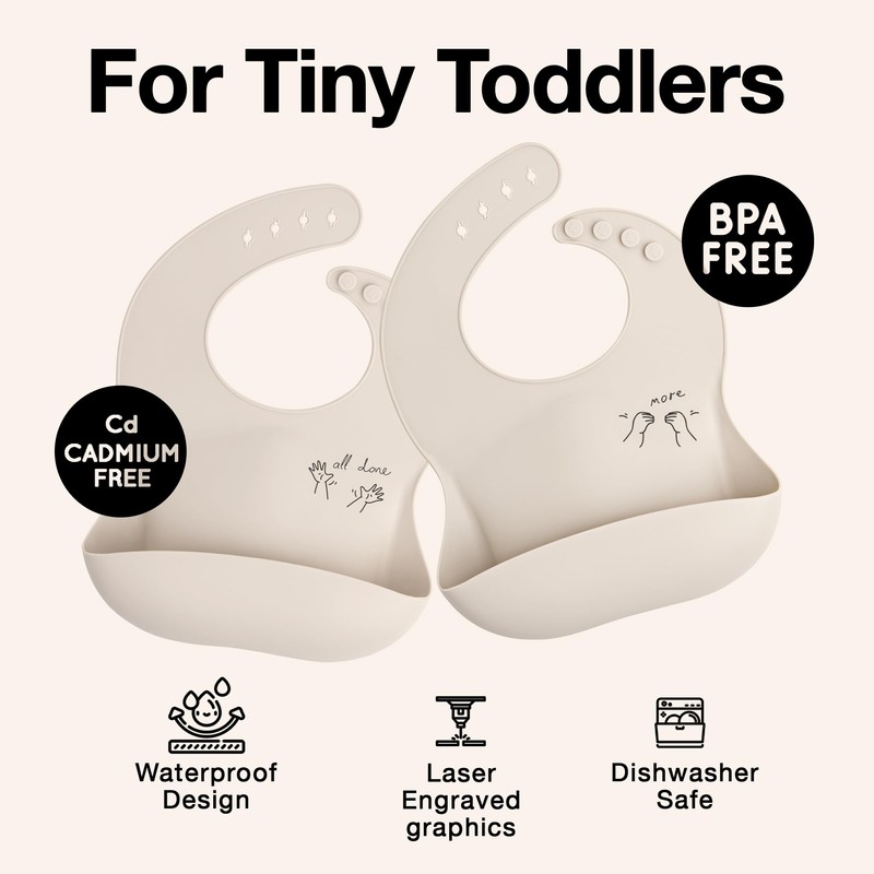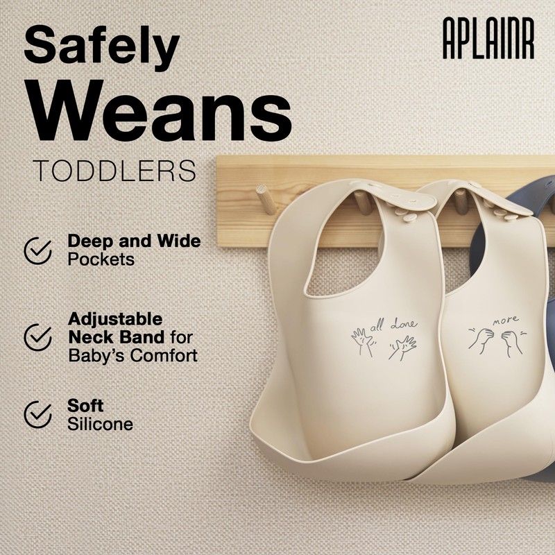 Aplainr Silicone Bibs are designed to be one of your essential baby-led weaning supplies. With mealtime sign graphics engraved on the bib, you can help your little one learn and communicate before they can even speak. By using simple signs for words like "more," and "all done," you can help your baby express their wants and needs, reducing frustration and promoting bonding and communication between you and your little one. The adjustable neckband ensures a comfortable and secure fit for babies and toddlers of all sizes, while the wide and deep pocket catches spills and crumbs, keeping your baby and their clothes clean and dry. Aplainr Silicone Bibs are tested and certified by an independent laboratory to be toxin- (BPA , BPS , PVC , lead and phthalate ) and safe for babies. Aplainr Bibs are easy to clean and dishwasher-safe. Please wash before use.
