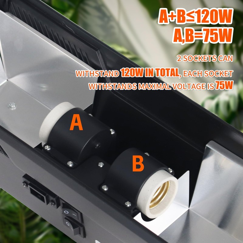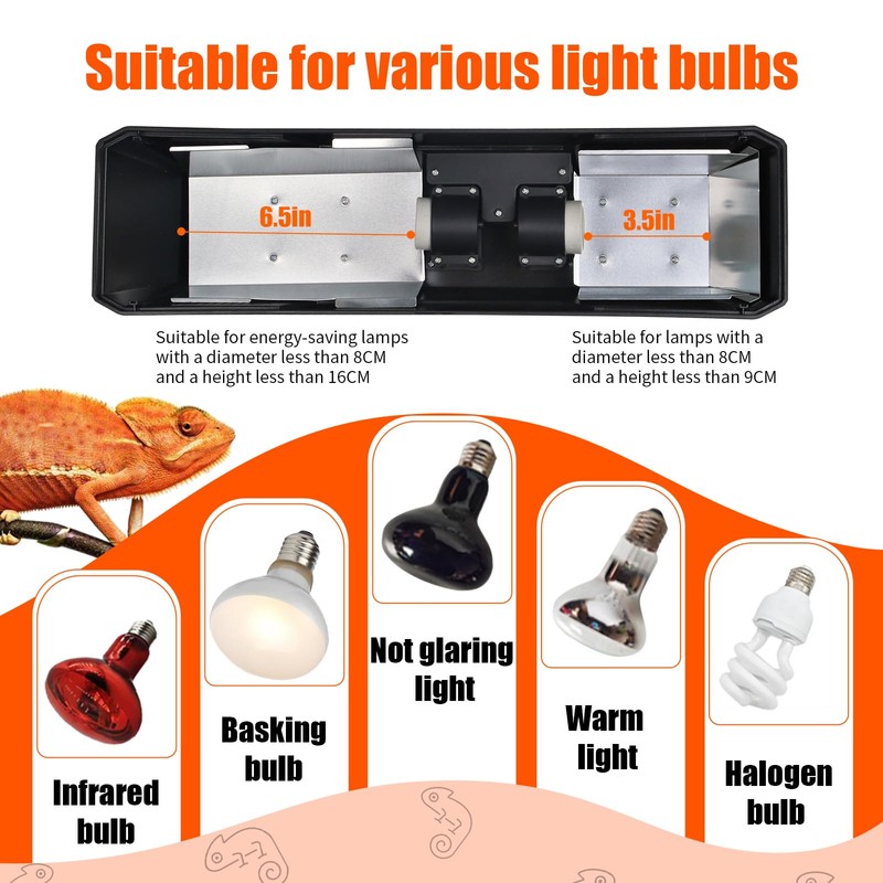 - Combo Reptile Lamp: This integrated dual reptile lamp fixture is designed to hold two reptile lamps of your choice, including heat lamps, UVB lamps, basking lamps, daylight lamps, and nightlight lamps, etc. You can assemble any two reptile bulbs together.