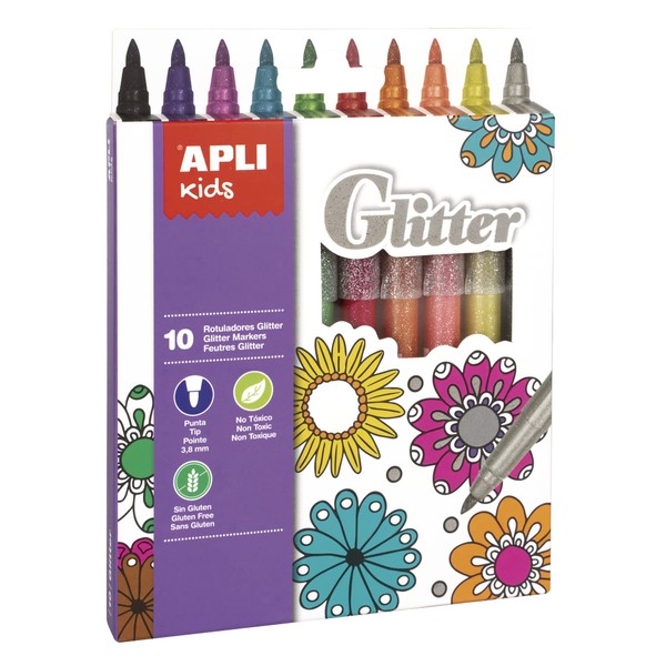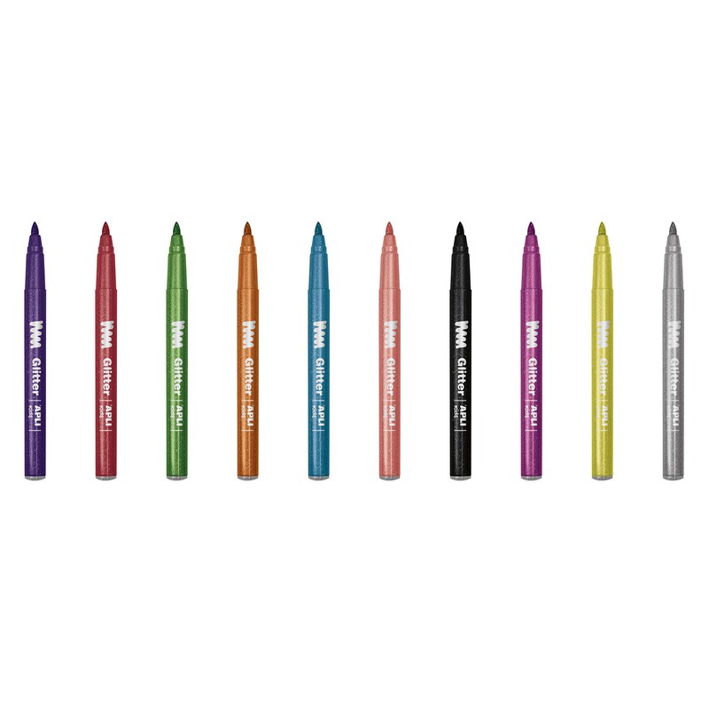 - Pack of 10 Glitter Felt Tip Pens Size: Ø 12 x 137 mm in assorted colours: Black, Purple, Pink, Blue, Green, Red, Orange, Salmon, Ochre and Grey.