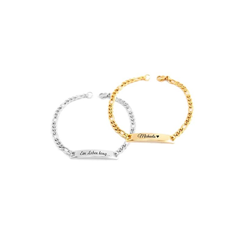 - ♥ Stainless steel – Figaro bracelet with engraving plate. New For girls, ladies and petite wrists. The engraving plate can be engraved according to your wishes. The bracelet is made of polished 316L stainless steel. The bracelet is available in 2 colours: gold or silver