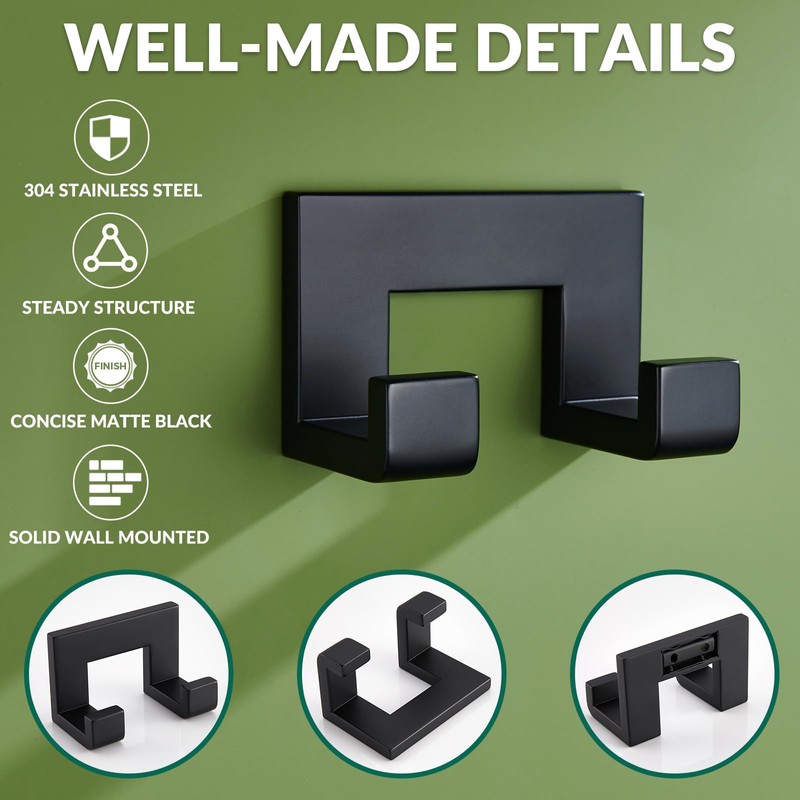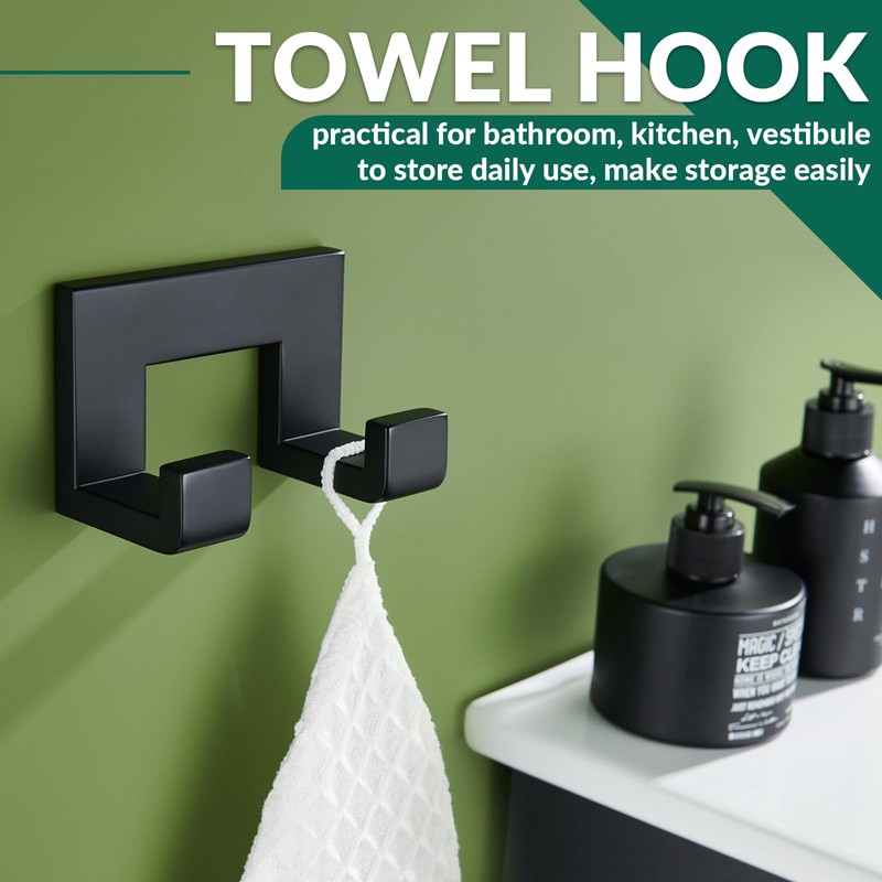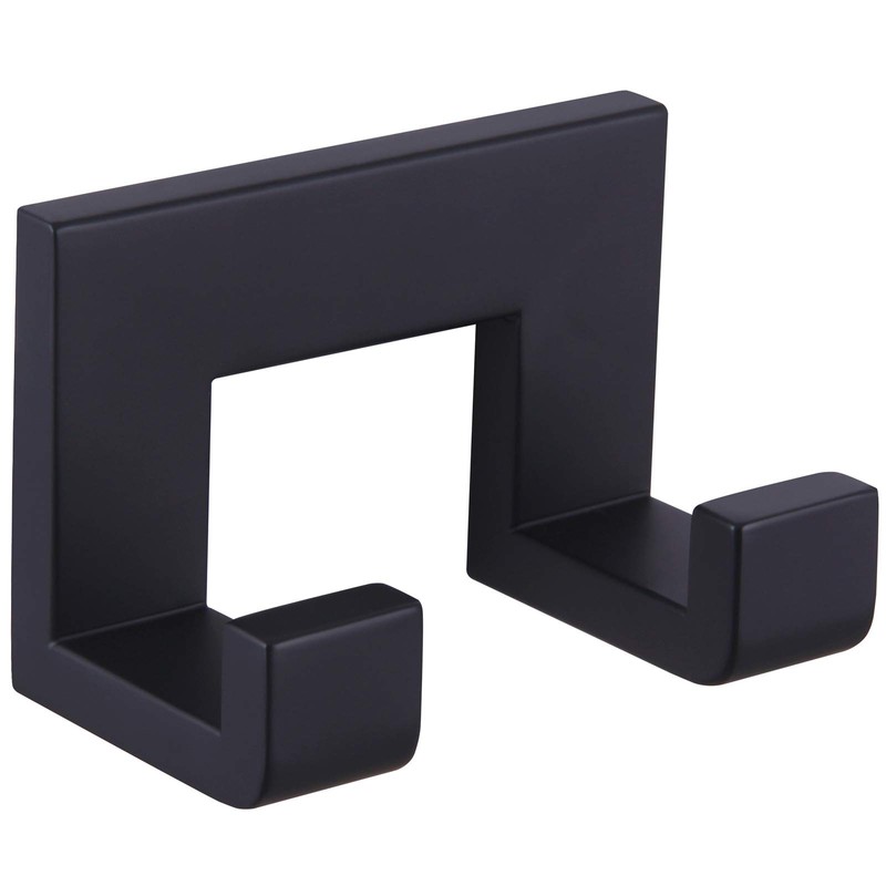 APLusee Double Robe Towel Hook Matte Black, SUS 304 Stainless Steel Square Dual Coat Hook, Utility Bath Kitchen Storage Hanger Holder
