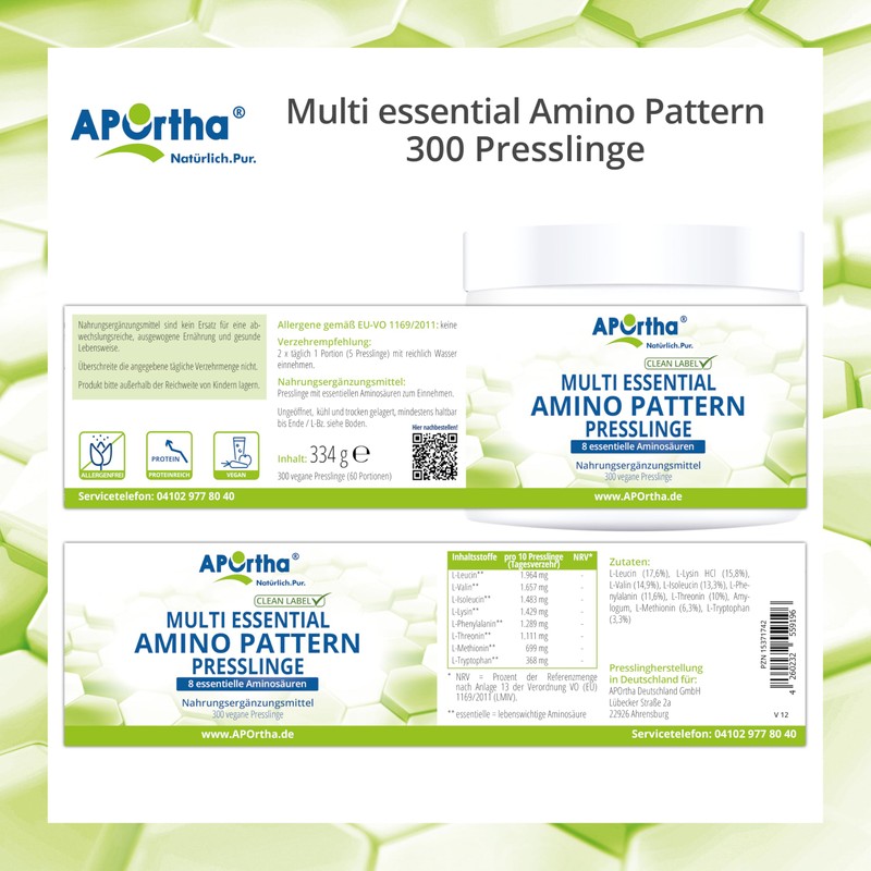 - PREMIUM AMINO PATTERN: APOrtha Amino Pattern Presslinge enthalten 8 essentielle Aminos?uren in einer abgestimmten Zusammensetzung. Jede Portion (5 Presslinge) liefert 5.000 mg reine EAA. Verzehrempfehlung: 2 x t?glich 1 Portion mit reichlich Wasser einnehmen.