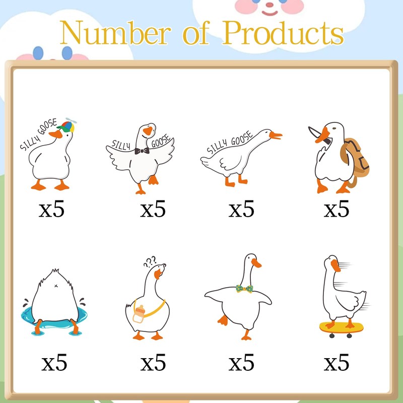 The set contains 40 cupcake toppers, 8 cute silly goosepatterns, 5 of each, suitable for celebrating goose theme parties; high quality materials ensure safety and lightweight, easy to use, decorate cupcakes and other desserts, add a joyful atmosphere to goose theme parties